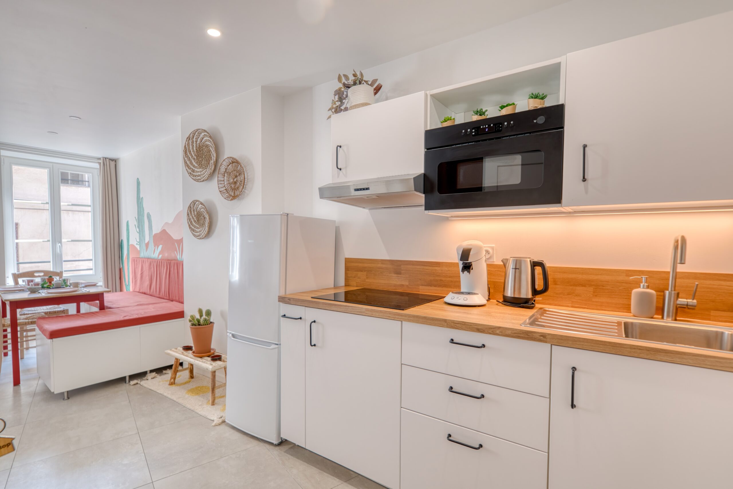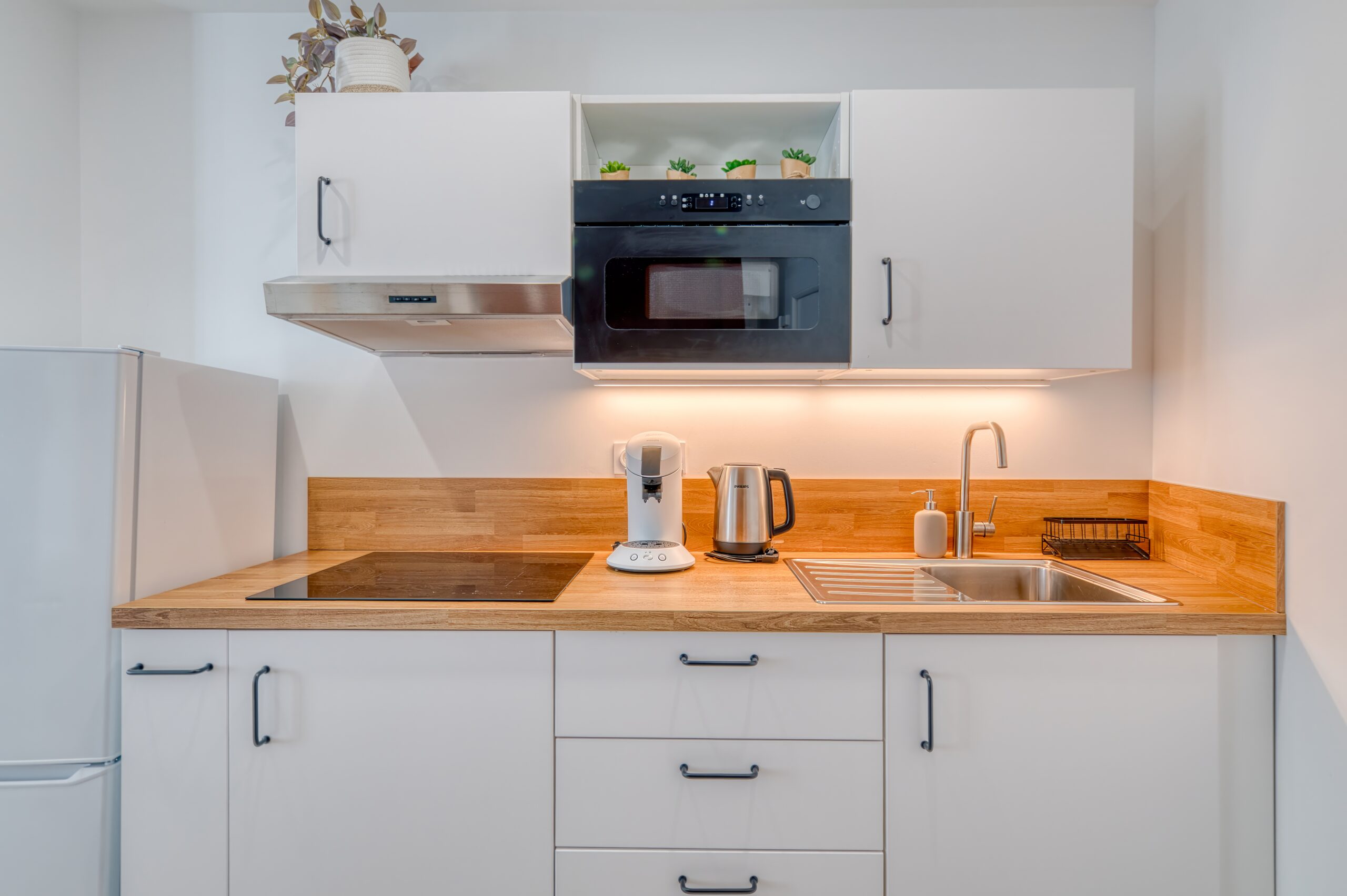 Plaques à induction, four-micro-ondes, réfrigérateur/congélateur, cafetière et bouilloire.