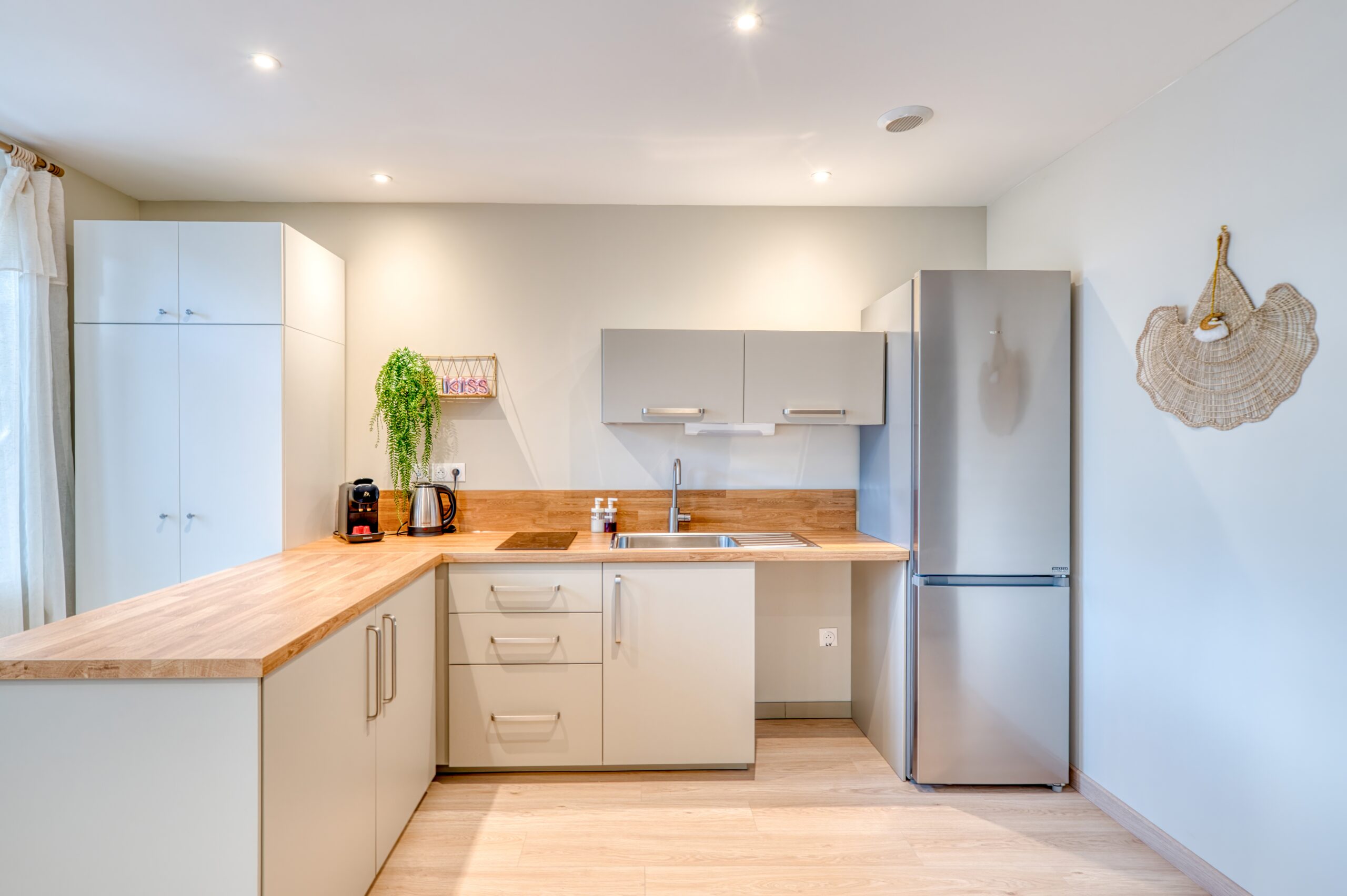 Plaques à induction, four-micro-ondes, réfrigérateur/congélateur, cafetière et bouilloire.