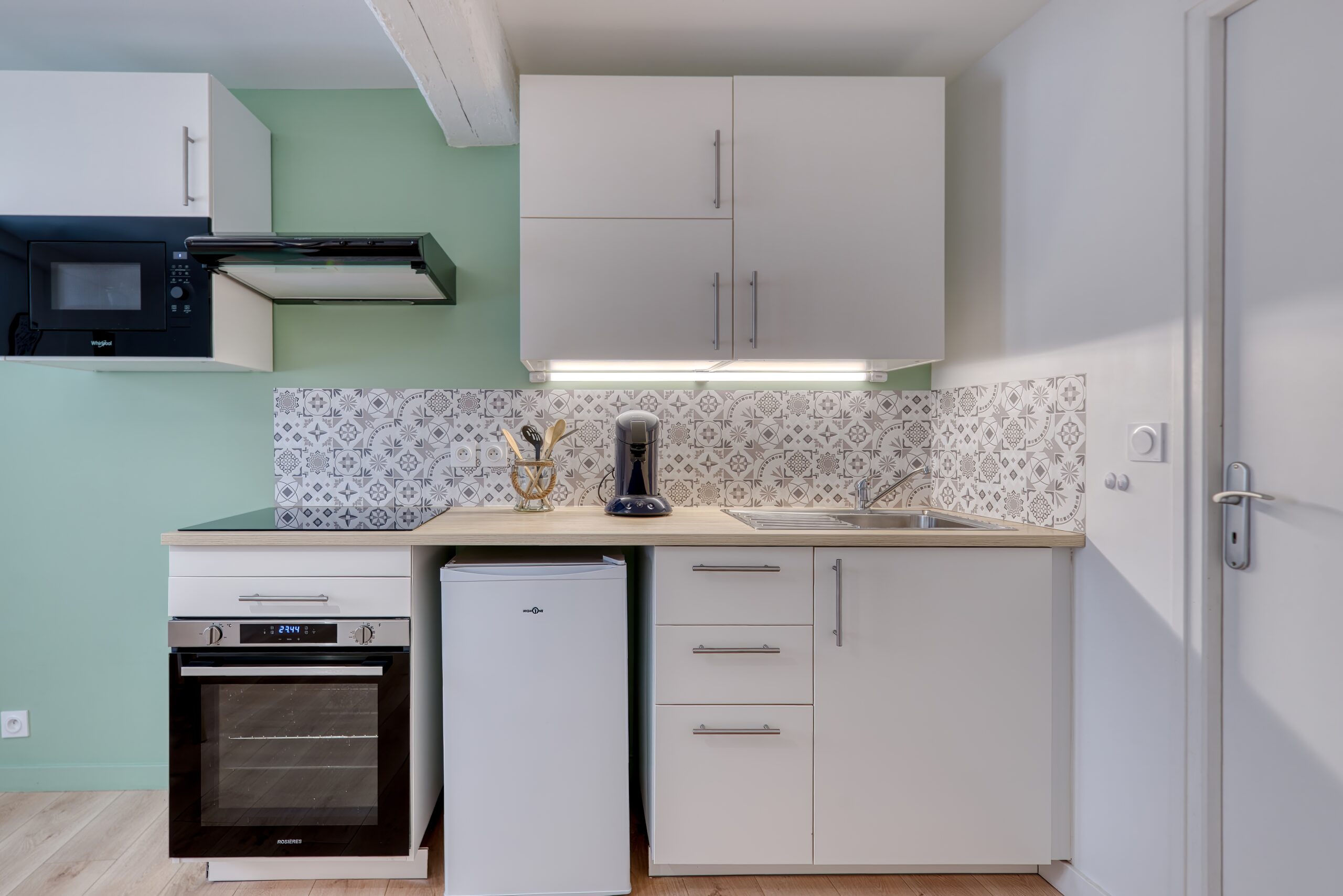 Plaques à induction, four-micro-ondes, réfrigérateur/congélateur, cafetière et bouilloire.